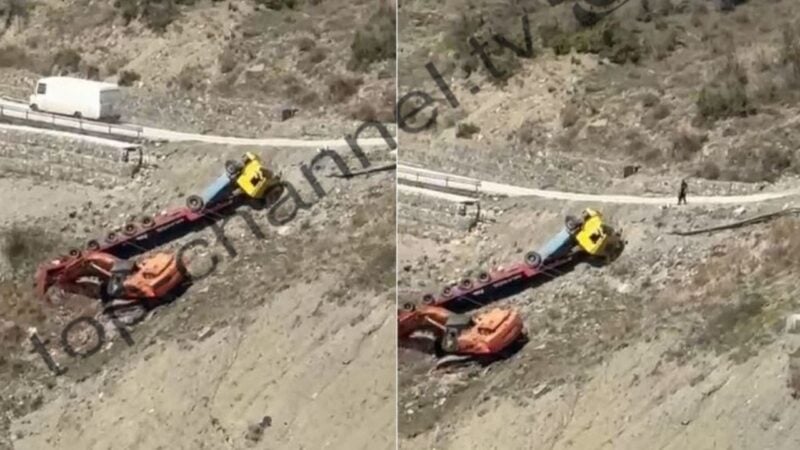 Po transportonte një ekskavator, përmbyset mjeti i tonazhit të rëndë në Moglicë të Korçës