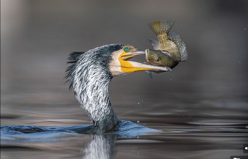 Kormoranti gjigand duke kapur peshk në një liqen në Izrael.