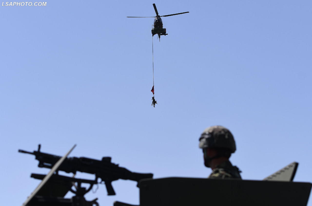 Një helikopter “Black Hawk”, me 3 ushtarë të forcave speciale të cilët qëndronin në një litar, ku ishte vendosur edhe flamuri shqiptar dhe ai amerikan, fluturoi mbi sheshin Nënë Tereza.