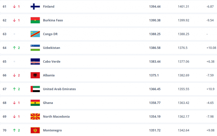 Pas humbjes 3-0 ndaj Kilit dhe asaj 1-0 me Suedinë, kombëtarja kuqezi renditet në vendin e 66-të në klasifikimin e përditësuar për muajin prill, nga i 64-ti ku ndodhej dy muaj më parë, pasi ka humbur 7.59 pikë si rezultat i disfatave në testet e zhvilluara para pak ditësh.