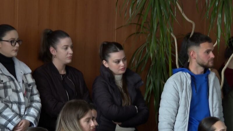 Të arrestuarit kanë mbërritur në gjykatë. Në ambientet e jashtme të gjykatës ka prani njerëzish dhe forca policie.