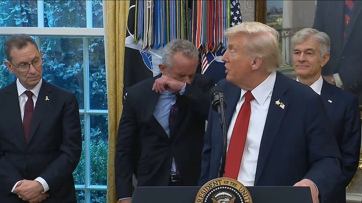 Ndërsa Trump po bënte marrëveshjen me Pfizer dhe Drejtorin Ekzekutiv të saj, Albert Bourla, Robert Kennedy Jr, Sekretar i Shëndetësisë, teshtiu pranë presidentit.