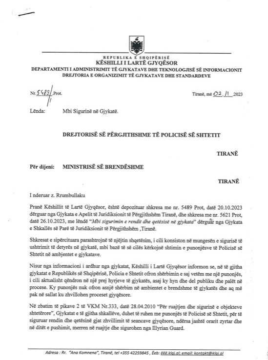 “Me shkresën nr. 5489/1 Prot., datë 02.11.2023, drejtuar Policisë së Shtetit dhe për dijeni Ministrisë së Brendshme, Këshilli ka kërkuar shtimin e punonjësve të Policisë së Shtetit në ambientet e brendshme të gjykatave dhe sallave të gjykimit gjatë zhvillimit të seancave.