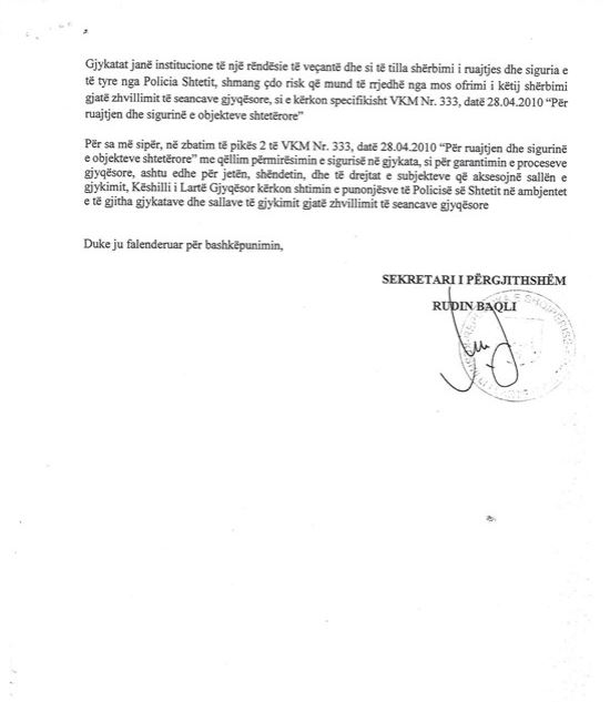 “Me shkresën nr. 5489/1 Prot., datë 02.11.2023, drejtuar Policisë së Shtetit dhe për dijeni Ministrisë së Brendshme, Këshilli ka kërkuar shtimin e punonjësve të Policisë së Shtetit në ambientet e brendshme të gjykatave dhe sallave të gjykimit gjatë zhvillimit të seancave.
