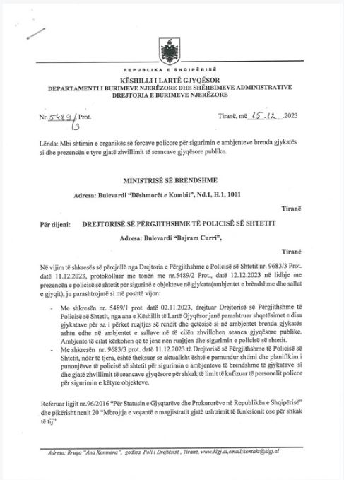 “Me shkresën nr. 5489/1 Prot., datë 02.11.2023, drejtuar Policisë së Shtetit dhe për dijeni Ministrisë së Brendshme, Këshilli ka kërkuar shtimin e punonjësve të Policisë së Shtetit në ambientet e brendshme të gjykatave dhe sallave të gjykimit gjatë zhvillimit të seancave.