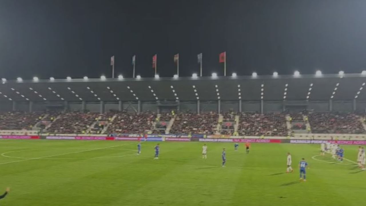 Përveç vërshëllimave të njëpasnjëshme në momentin kur lojtarët shqiptarë kapin topin, ata filluan me kore politike “Kosova është Serbi”.