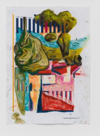 Ngjitës vaji mbi letër nga Edi Rama me titull “Pa titull”, që paraqet forma abstrakte shumëngjyrëshe, duke përfshirë vija blu dhe forma organike jeshile, mbi të dhëna numerike dhe tekst.