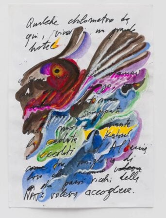 Vepra artistike “Pa titull” e Edi Ramës nga viti 2025, që paraqet tekst të shkruar me dorë dhe shenja abstrakte shumëngjyrëshe me shkopinj vaji, akuarel dhe stilolaps mbi letër, e vendosur në kornizë.