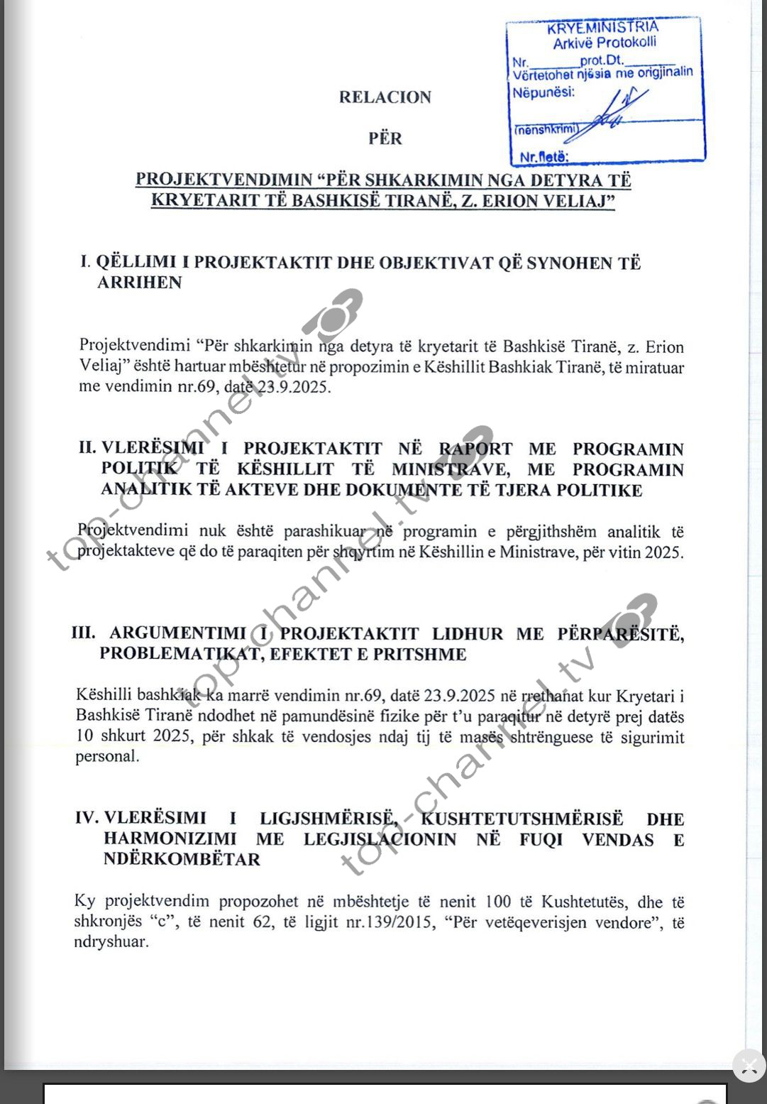 “Këshilli Bashkiak Tiranë ka konstatuar se mosparaqitja në detyrë, në rrethanat e sipërcituara dhe për një periudhë më të gjatë se tre muaj, përbën shkak ligjor për të propozuar shkarkimin e Kryetarit të Bashkisë. Fakti juridik i pamundësisë së paraqitjes në detyrë është fakt publik dhe vërtetësia e tij nuk mund të vihet në dyshim”, thotë Këshilli Bashkiak.