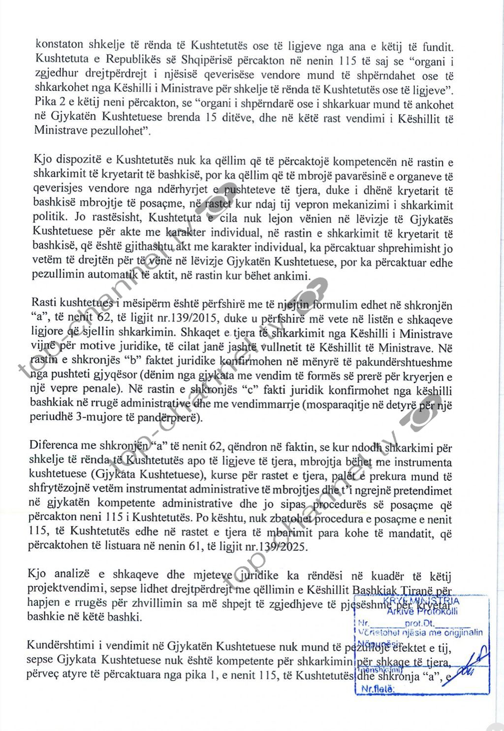 “Kundërshtimi i vendimit në Gjykatën Kushtetuese nuk mund të pezullojë efektet e tij, sepse Gjykata Kushtetuese nuk është kompetente për shkarkimin për shkaqe të tjera, përveç atyre të përcaktuara nga pika 1, e nenit 115, të Kushtetutës, dhe paraqitja e ankimit në Gjykatën Kushtetuese, në organin e gabuar për shqyrtimin e mjeteve ligjore të ankimit, nuk sjell efekte juridike”, shton më tej Këshilli Bashkiak.