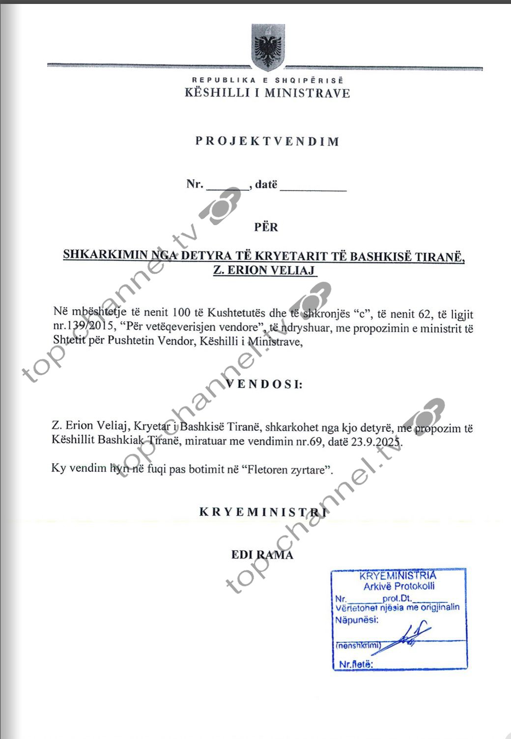 “Këshilli Bashkiak Tiranë ka konstatuar se mosparaqitja në detyrë, në rrethanat e sipërcituara dhe për një periudhë më të gjatë se tre muaj, përbën shkak ligjor për të propozuar shkarkimin e Kryetarit të Bashkisë. Fakti juridik i pamundësisë së paraqitjes në detyrë është fakt publik dhe vërtetësia e tij nuk mund të vihet në dyshim”, thotë Këshilli Bashkiak.
