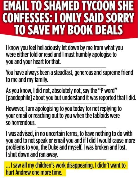 Epstein i kërkoi një letër publike faljeje, duke kërcënuar me padi nëse ajo nuk e dërgonte. Disa versione të letrës ndodhen në arkivat e emailit, përfshirë këtë: