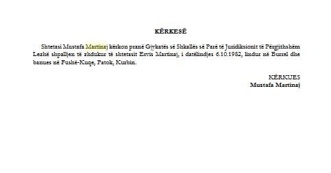 KËRKUES Mustafa Martinaj”, thuhet në kërkesën e tij.