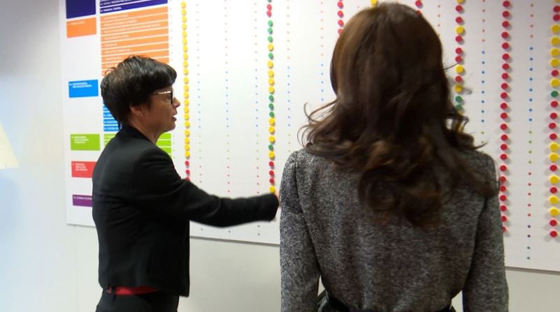 Kos dhe Spiropali u ndalën te “Muri i Zgjerimit” në zyrën e Komisioneres ku reflektohet progresi i vendeve drejt procesit të negociatave të anëtarësimit, dhe ku Komisionerja Kos thotë se një shtet dallon për suksesin mbresëlënës, Shqipëria.