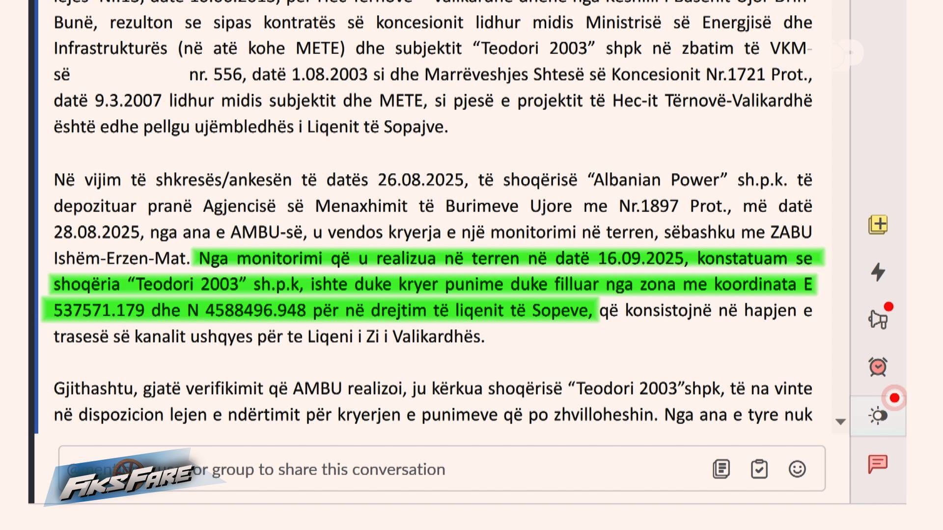 Fiks Fare denoncoi mbrëmjen e së martës se një firmë po sfidon hapur dhjetëra institucione shtetërore për kryerjen e punimeve pa leje për ndërtimin e një HEC-i në zonën e Martaneshit.