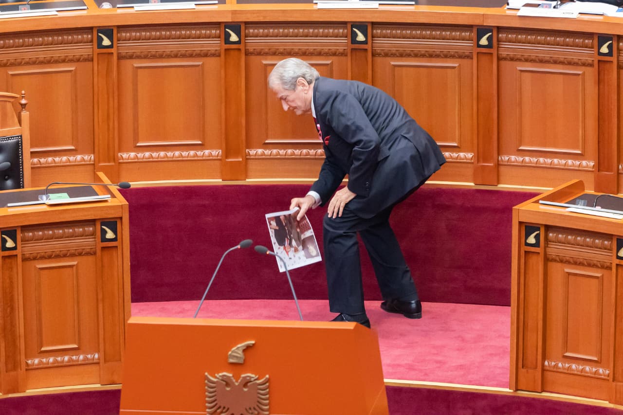 Sikurse duket në fotot e shkrepura nga LSA, sapo lideri i demokratëve kthehet në foltore për të nisur fjalimin, Toni Gogu e rrëzon foton me një të fryrë.
