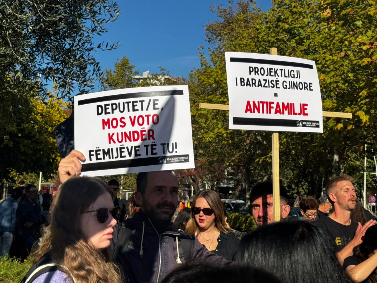 Protesta është thirrur nga “Koalicioni Shqiptar pro Familjes dhe Jetës”. Me pankartat “deputetë, mos votoni kundër fëmijëve”, “projektligji i barazisë gjinore, anti-familje”, “largoni duart nga fëmijët”, ata kërkojnë të mos miratohet projektligji.