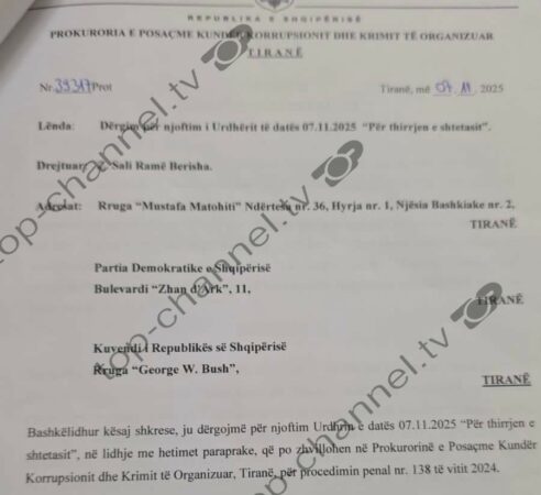 Më herët sot gazetari i Top Channel, Muhamed Veliu ka siguruar dokumentin e fletëthirrjes, ku ndër të tjera thuhet “Për nevoja të hetimit, me urdhrin e datës 03.11.2025 “Për thirrjen e shtetasit”, është urdhëruar thirrja e shtetasit Sali Berisha.