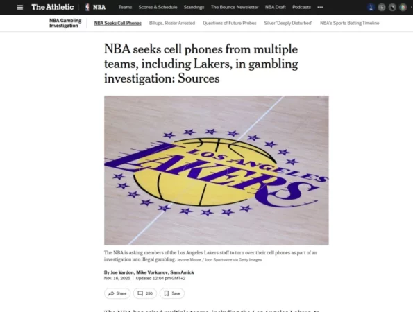 Lëkundje të reja sizmike në ligën më të lartë të basketbollit në botë pas një raporti nga The Athletic që i jep një dimension tjetër skandalirt të basteve të paligjshme që kanë tronditur besueshmërinë e organizatës për rreth një muaj. Sipas raportit, NBA, u ka kërkuar disa ekipeve, përfshirë Los Angeles Lakers, të dorëzojnë dokumente dhe pajisje elektronike, si pjesë e hetimit mbi bastet e paligjshme sportive. Hetimi për këtë çështje u vendos të zgjerohet pasi komisione të ndryshme të Dhomës së Përfaqësuesve dhe Senatit kërkuan shpjegime nga NBA në lidhje me mënyrën se si nuk zbuloi indikacione të mëparshme të pjesëmarrjes në praktika të tilla, pas arrestimit të mbrojtësit të Miami Heat, Terry Rozier, dhe trajnerit të Portland Trail Blazers, Chauncey Billups.