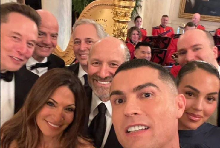 Por gjithashtu u kujtoi shumë njerëzve selfien nga Oscarët e vitit 2014, ku ishin përfshirë disa nga njerëzit më të dashur të showbiz-it. Ronaldo pozon me partneren e tij Georgina (poshtë djathtas), drejtorin ekzekutiv të Tesla-s, Elon Musk, i cili u shfaq për herë të parë në Shtëpinë e Bardhë pas një kohe të gjatë, presidentin e FIFA-s, Gianni Infantino, sekretarin amerikan të tregtisë, Howard Lutnick (i katërti nga e majta).