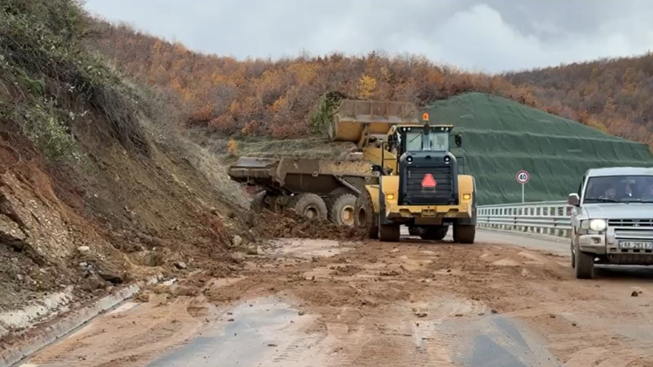 Një masiv i madh dheu është shkëputur duke zënë njërën prej korsive. Aktualisht aty ndodhen grupet e punës për te larguar inertet nga rruga.