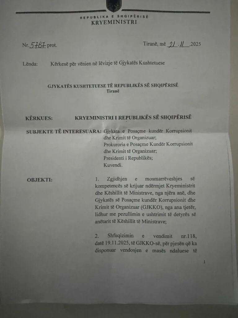 “Zgjidhjen e mosmarrëveshjes së kompetencës së krijuar ndërmjet Kryeministrit dhe Këshillit të Ministrave, nga njera anë, dhe Gjykatës së Posaçme kundër Korrupsionit dhe Krimit të Organizuar (GJKKO), nga ana tjetër, lidhur me pezullimin e ushtrimit të detyrës së anëtarit të Këshillit të Ministrave.