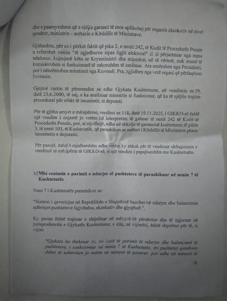 Në shkresë thuhet gjithashtu se kryeministri vlerëson se vendimi në fjalë është një akt antikushtetues për arsyet e mëposhtme: