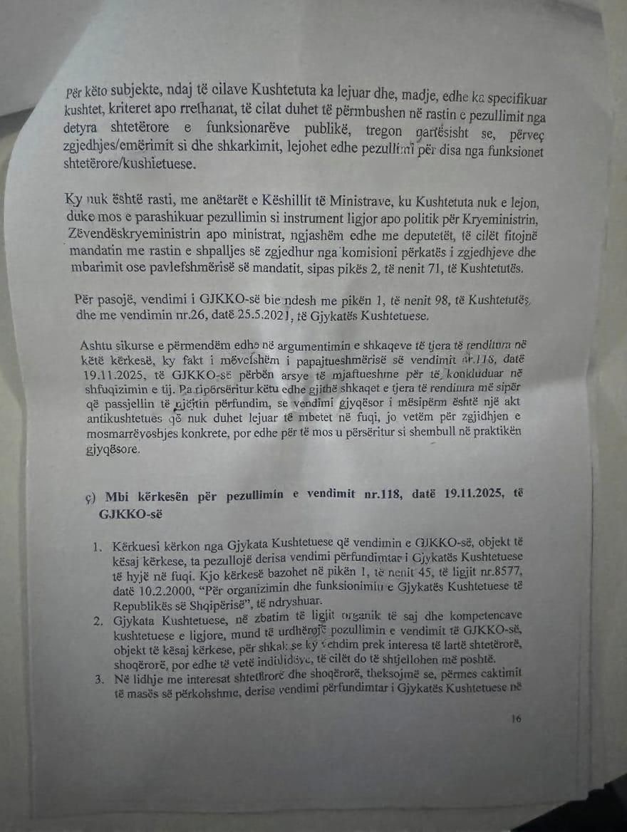 Shfuqizimin e vendimit nr.118, datë 19.11.2025, të GJKKO-së, për pjesën që ka disponuar vendosjen e masës ndaluese të pezullimit të ushtrimit të detyrës së Zëvendëskryeministrit dhe ministër i Infrastrukturës dhe Energjisë, si një akt që cenon garancinë e imunitetit të anëtarit të Këshillit të Ministrave, parimin e ndarjes së pushteteve dhe kompetencat e organeve, që Kushtetuta ka caktuar si autoritete, që propozojnë, emërojnë dhe miratojnë ministrat në detyrë. Pezullimin e efekteve të vendimit të mësipërm të GJKKO-së, deri në përfundimin e gjykimit të kësaj kërkese nga Gjykata Kushtetuese. Interpretimin e pikës 3, të nenit 103, të Kushtetutës, në kuptimin që “Anëtari i Këshillit të Ministrave, duke gëzuar imunitetin e deputetit, përfiton nga të gjitha garancitë procedurale, që i njeh jo vetëm Kushtetuta këtij të fundit, por edhe legjislacioni procedural penal”.