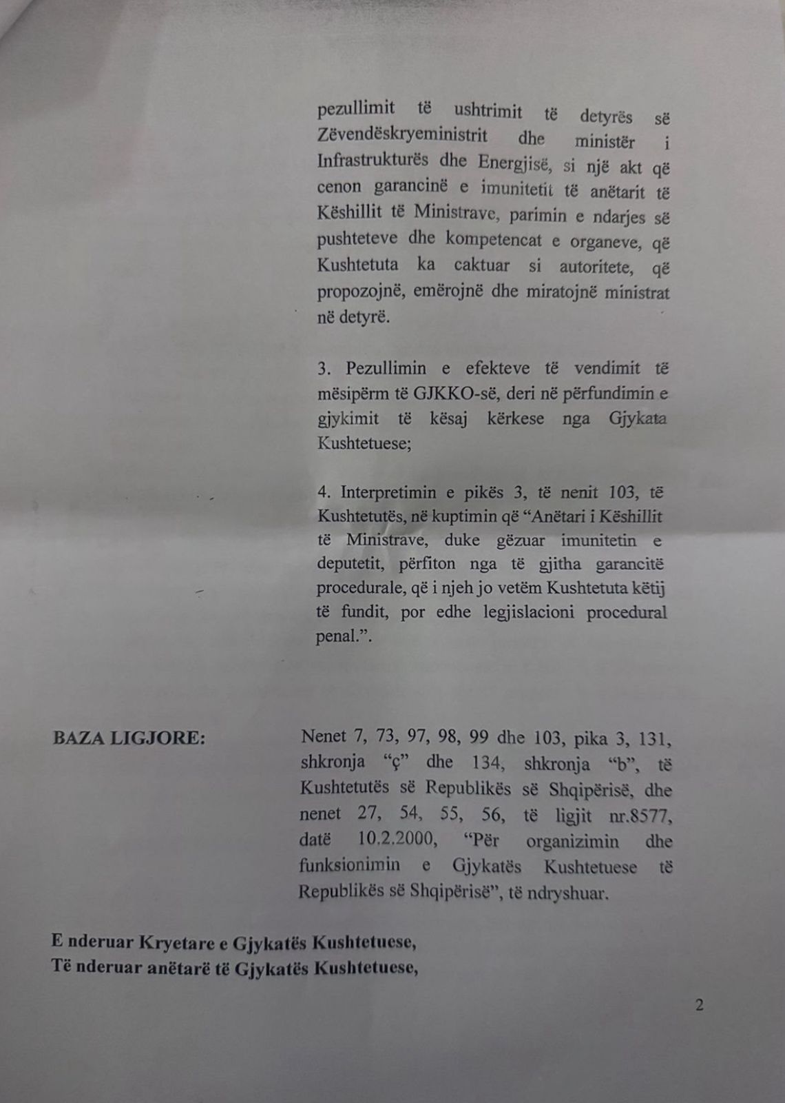 Shfuqizimin e vendimit nr.118, datë 19.11.2025, të GJKKO-së, për pjesën që ka disponuar vendosjen e masës ndaluese të pezullimit të ushtrimit të detyrës së Zëvendëskryeministrit dhe ministër i Infrastrukturës dhe Energjisë, si një akt që cenon garancinë e imunitetit të anëtarit të Këshillit të Ministrave, parimin e ndarjes së pushteteve dhe kompetencat e organeve, që Kushtetuta ka caktuar si autoritete, që propozojnë, emërojnë dhe miratojnë ministrat në detyrë. Pezullimin e efekteve të vendimit të mësipërm të GJKKO-së, deri në përfundimin e gjykimit të kësaj kërkese nga Gjykata Kushtetuese. Interpretimin e pikës 3, të nenit 103, të Kushtetutës, në kuptimin që “Anëtari i Këshillit të Ministrave, duke gëzuar imunitetin e deputetit, përfiton nga të gjitha garancitë procedurale, që i njeh jo vetëm Kushtetuta këtij të fundit, por edhe legjislacioni procedural penal”.
