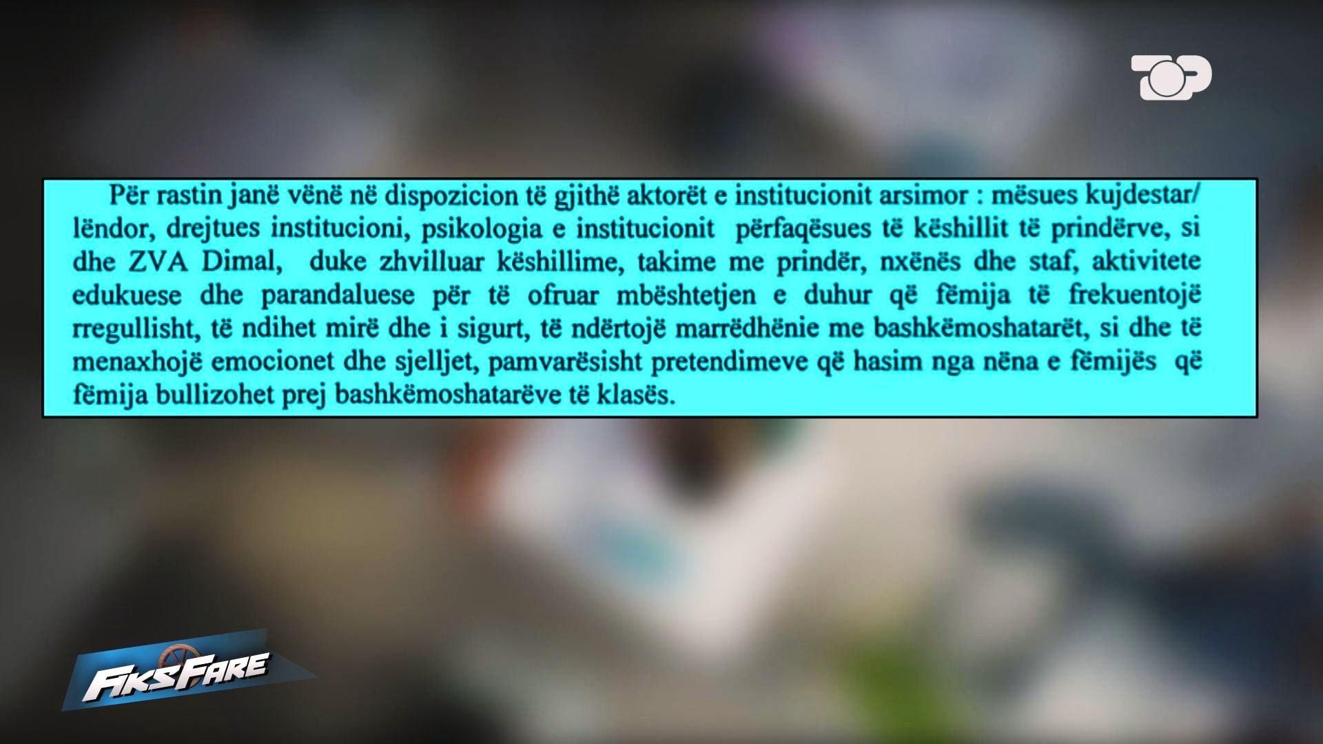 Një nënë nga Dimal ka denoncuar në emisionin Fiks Fare se djali i saj, nxënës i klasës së gjashtë në shkollën 9-vjeçare “Sali Zhuka”, është viktimë e bullizimit prej tre vitesh, pavarësisht se ka ndërruar disa shkolla në përpjekje për të gjetur një ambient më të sigurt.