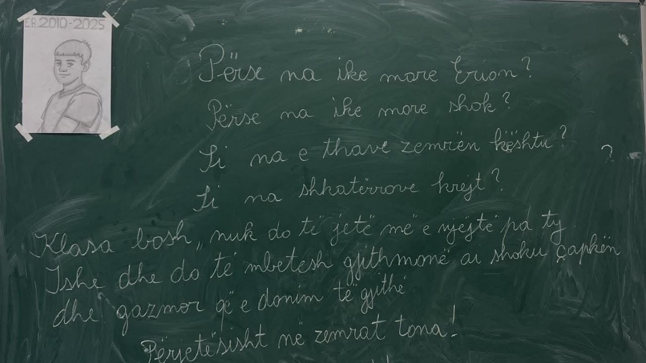 Nxënësit e klasës së 15-vjeçarit Erion Boba në gjimnazin “Dom Nikoll Kaçorri” në Durrës kanë shkruar sot një mesazh prekës në tabelën e klasës, duke shprehur dhembjen e madhe për humbjen e parakohshme të jetës së shokut të tyre dhe boshllëkun që ai ka lënë pas.