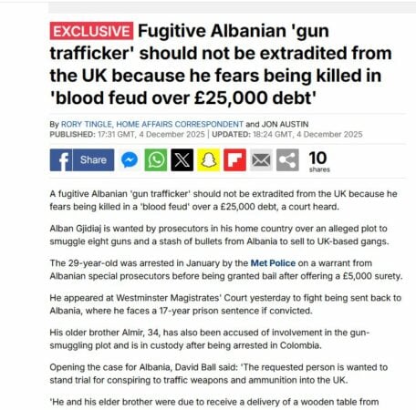 “I kërkuari shqiptarë në arrati për trafik pistoletash thotë se nuk duhet ekstraduar nga frika gjakmarrjes për një borxh 25.000 stërlina”, ky është titulli Daily Mail online.