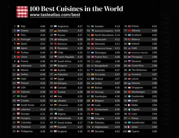 Ndërsa Shqipëria u rendit në vendin e 77-të, duke treguar se gastronomia shqiptare po fiton vlerësim ndërkombëtar, edhe pse ende larg primatit të vendeve më të njohura për kuzhinën.