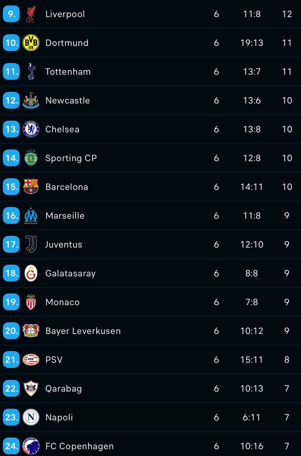 Ai ndiqet nga Bayerni me 15 pikë dhe më pas vijnë PSG, City e Atalanta me nga 13 pikë. Interi, Reali e Atletico mbyllin Top 8.