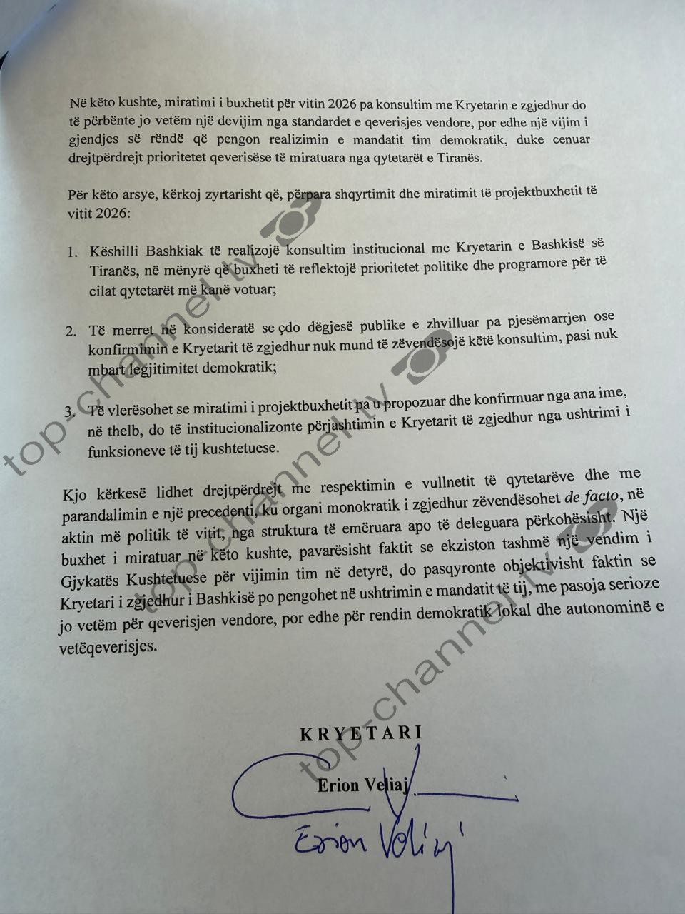 Ju drejtohem në cilësinë time kushtetuese dhe ligjore si Kryetar i zgjedhur i Bashkisë së Tiranës, për t’ju kërkuar që, përpara shqyrtimit dhe miratimit, të konsultoni dhe të merrni paraprakisht mendimin dhe vullnetin tim institucional mbi projektbuxhetin e Bashkisë së Tiranës për vitin 2026.