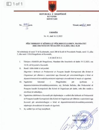 Nga burime prej Kuvendit gazetari i Top Channel Muhamed Veliu ka mësuar se Niko Peleshi ka njoftuar Këshillin për Rregulloren, Imunitetin dhe Mandatet i cili do të mblidhet 19 dhjetor 2025, në orën 10:30.