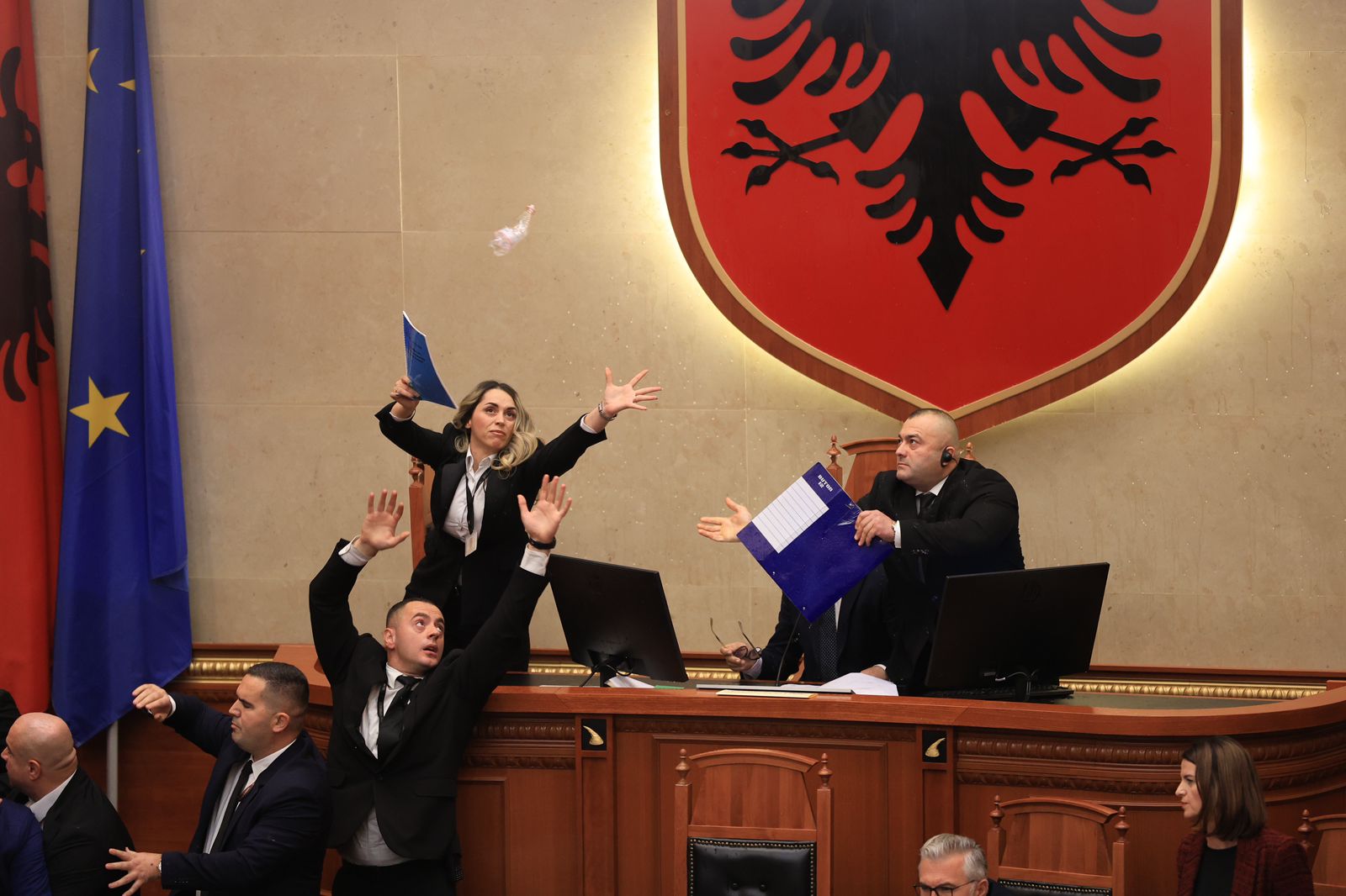 Deputetët demokratë zunë vendet e ministrave pa nisur ende seanca, çka bëri që të përplasen me efektivët e Gardës.