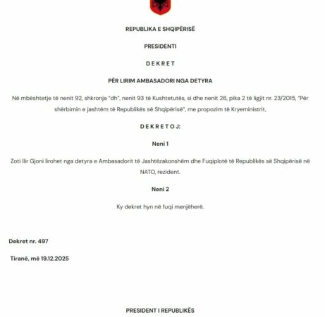 Ilir Gjoni ishte dekretuar ambasador nga Begaj në vitin 2023, ndërsa sot po Presidenti ka dekretuar edhe lirimin nga detyra të tij, dekret që hyn në fuqi menjëherë.