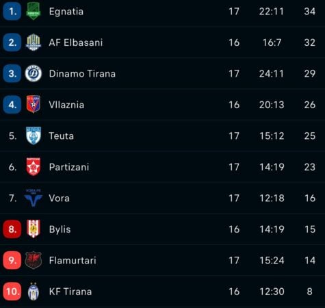 Në fundin e tabelës, situata mbetet e vështirë për Tiranën, që mbyll renditjen me 8 pikë, si dhe për Flamurtarin me 14 pikë. Të dyja skuadrat ndodhen aktualisht në zonën e rënies nga kategoria.