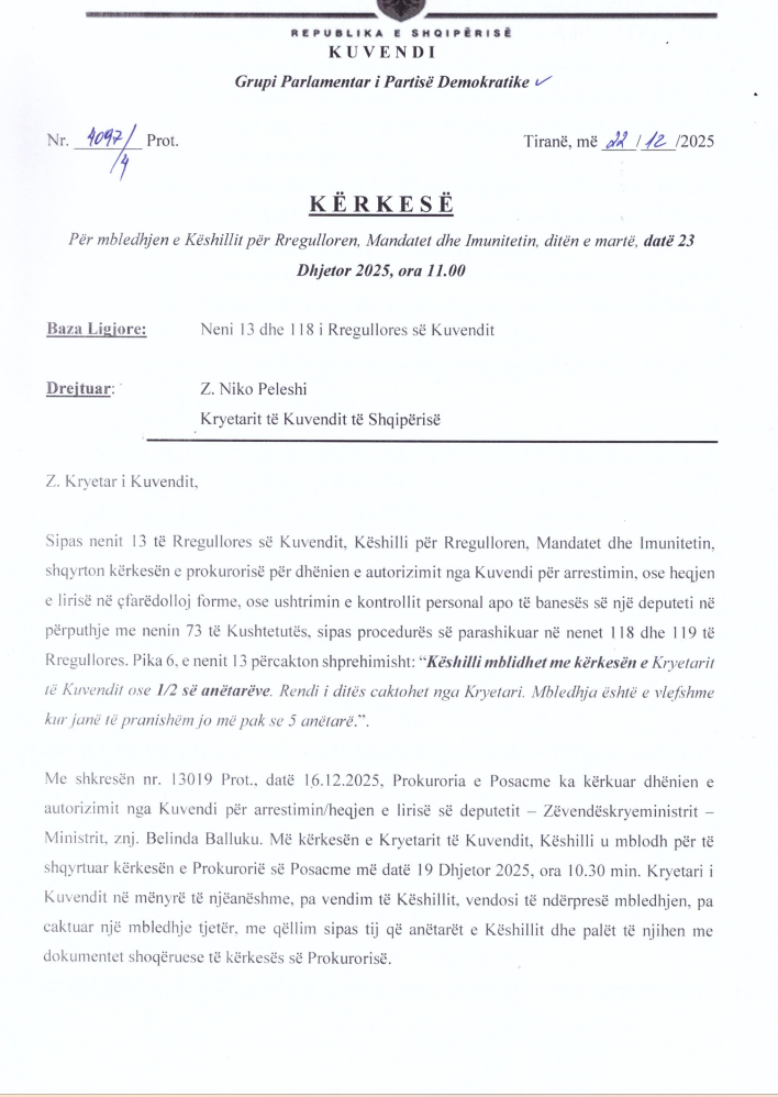 Partia Demokratike, i ka dërguar një letër kryetarit të Kuvendit, Niko Peleshi në lidhje me mandatin e zv.kryeministres Belinda Balluku.