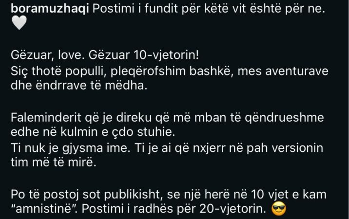 “Postimi i fundit për këtë vit është për ne. Gëzuar, love. Gëzuar 10-vjetorin! Siç thotë populli, pleqërofshim bashkë, mes aventurave dhe ëndrrave të mëdha. Faleminderit që je direku që më mban të qëndrueshme edhe në kulmin e çdo stuhie”, shkruan ajo.