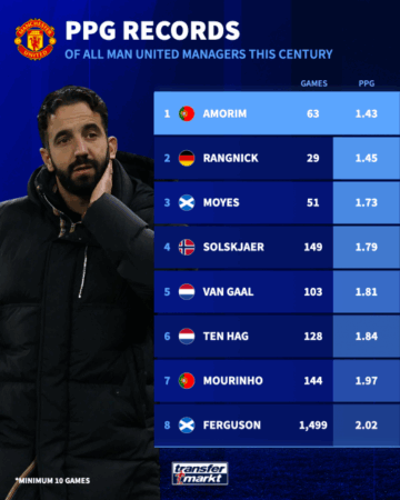 Si i tillë, rekordi i Amorimit në klub prej vetëm 1.43 pikësh për ndeshje ishte një rënie e dukshme nga ai i paraardhësit të tij Erik Ten Hag, i cili ishte 1.84 pikë për ndeshje në të gjitha garat përpara se të shkarkohej në fund të vitit 2024. Në fakt, mesatarja e Amorimit është rezultati më i keq për çdo trajner të Man Utd që kur Sir Alex Ferguson u tërhoq në vitin 2013. Dhe sigurisht sugjeron që klubi nuk kishte zgjidhje tjetër veçse të ndahej nga një trajner që nuk po nxirrte më të mirën nga skuadra e tij. Trajneri i fundit i Man Utd që kishte një rekord më të keq se Amorimi ishte Frank O’Farrell, i cili u shkarkua në vitin 1972 pasi kishte mesatarisht vetëm 1.41 pikë për ndeshje.