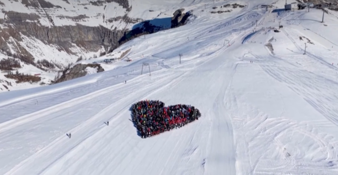 Rreth 1,000 skiatorë gdhendën një zemër gjigante në dëborë në një pistë të turneut botëror në Crans-Montana, duke i bërë homazh viktimave të zjarrit vdekjeprurës të javës së kaluar në vendpushimin zviceran.