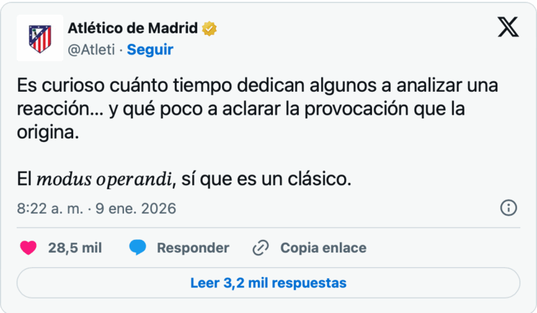 Dhe në fakt Los Colchoneros reaguan përmes një postimi në rrjetet sociale. ‘Është kurioze të shohësh sa kohë i kushtojnë disa analizimit të një reagimi dhe sa pak e qartësojnë provokimin që e shkaktoi atë. Modus operandi, po që është një klasike’-shkruante Atletico në një postim në X duke i dalë në mbrojtje Diego Pablo Simeone.