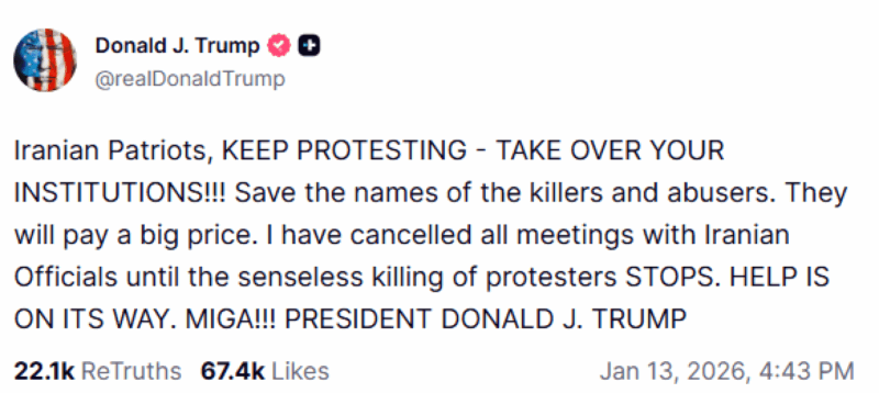 Donald Trump, në një postim në platformën Truth Social, u bëri thirrje protestuesve iranianë të “vazhdojnë të protestojnë”, duke paralajmëruar se “vrasësit dhe abuzuesit do të paguajnë një çmim të lartë”, megjithatë, pa specifikuar se çfarë forme mund të marrë ndihma e premtuar.