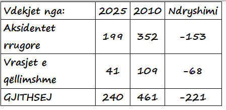 Siç ilustrohet në tabelën e mëposhtme, vdekjet rrugore dhe nga krimi kanë shënuar një reduktim drastik në 15 vjetët e fundit në Shqipëri – 43.5% janë reduktuar vdekjet rrugore dhe 60.6% vdekjet nga krimi.