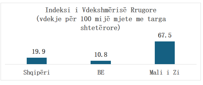 Po si krahasohemi ne me mesataren e vdekshmërisë rrugore të Bashkimit Europian dhe me të fqinjit tonë verior Mal i Zi (vend kandidat për në BE)? Në qoftë se vdekjet e këmbësorëve/biçiklistëve/motoçiklistëve (që përbëjnë aktualisht 57% të gjithë vdekjeve rrugore këtu) do të ishin të krahasueshme në përqindje me BE-në (20%), ne do ta kishim sot indeksin e vdekshmërisë rrugore të barabartë me mesataren europiane! Ndërkohë, vdekshmëria rrugore në Shqipëri është shumë më e ulët se në Malin e Zi (shihni grafikun e mëposhtëm).