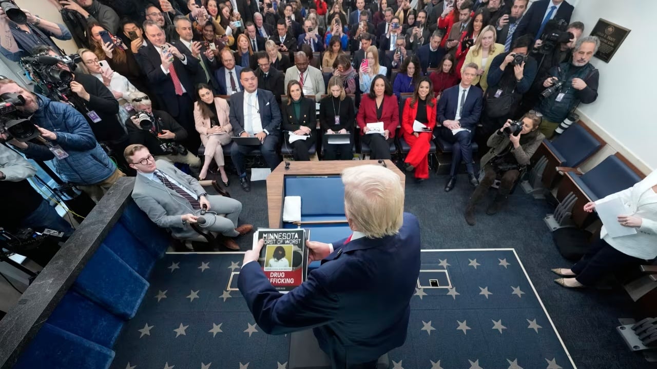 Presidenti amerikan Donald Trump hapi konferencën e tij për shtyp duke shfletuar një grumbull dokumentesh që përmbanin fotografi të personave që, sipas tij, ishin migrantë pa dokumente, të cilët ishin arrestuar si pjesë e përpjekjeve të tij të forcuara për zbatimin e ligjit.