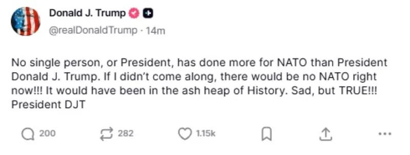 “Asnjë person, asnjë president, nuk ka bërë më shumë për NATO-n”, shkroi presidenti në Truth Social.