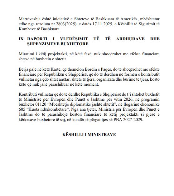 Sipas dokumentit zyrtar, marrëveshja është miratuar në parim nga Këshilli i Ministrave me vendimin nr.45, datë 21 janar 2026, dhe parashikon që Shqipëria, e përfaqësuar nga Kryeministri Edi Rama, të bëhet pjesë e Kartës themeluese të Bordit të Paqes.
